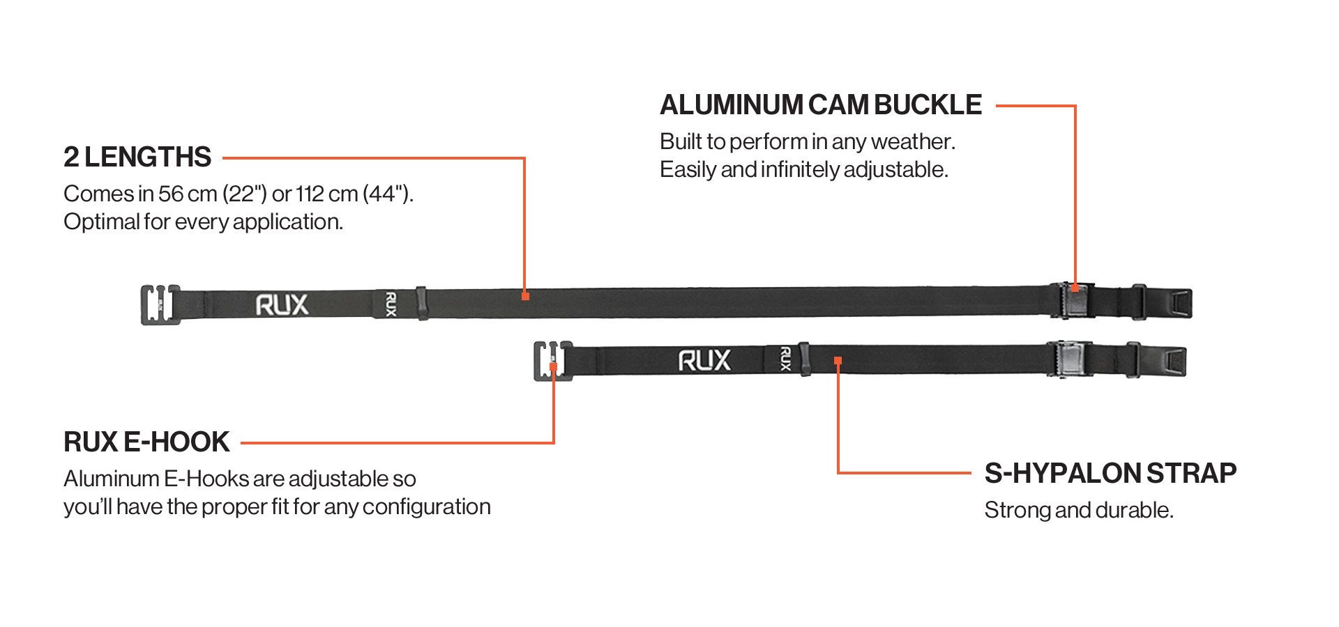 Offered in two different lengths these durable laser-cut S-Hypalon straps are infinitely adjustable and the aluminum RUX E-Hooks ensure you’ll have the proper fit for any platform configuration and mode of transportation.